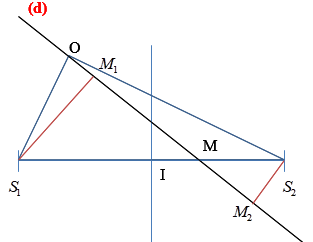 Trên mặt nước có hai nguồn sóng kết hợp \({S_1}\) và \({S_2}\) cách nhau 13cm, dao động cùng pha, cùng biên độ a theo phương thẳng đứng. Điểm O thuộc mặt nước cách \({S_1}\) và \({S_2}\) lần lượt là 5cm và 12cm dao động với biên độ 2a. M là một điểm thuộc đoạn \({S_1}{S_2}\), gọi (d) là một đường thẳng đi qua O và M. Cho M di chuyển trên đoạn \({S_1}{S_2}\) đến vị trí sao cho tổng khoảng cách từ hai nguồn đến đường thẳng (d) lớn nhất thì phần tử nước tại M dao động với biên độ 2a. Xét trong khoảng \({S_1}{S_2}\) tối thiểu, số điểm dao động với biên độ 2a là