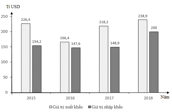 Cho biểu đồ về xuất nhập khẩu của Thái Lan giai đoạn 2015-2018: