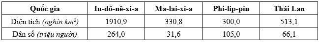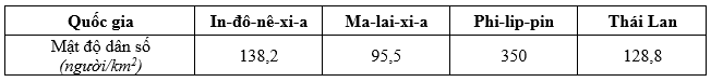Cho bảng số liệu:DIỆN TÍCH VÀ DÂN SỐ CỦA MỘT SỐ QUỐC GIA NĂM 2017 (Nguồn: Niên giám thống