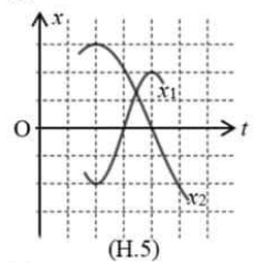 Hai điểm sáng dao động điều hòa trên trục Ox xung quanh vị trí cân bằng chung O. Một phần đồ thị biểu diễn sự phụ thuộc li độ của hai điểm sáng vào thời gian như hình vẽ (H.5). Tại thời điểm mà độ lớn vận tốc tương đối của điểm sáng (1) so với điểm sáng (2) đạt cực đại lần thứ 18 thì tỷ số \(\left| {\dfrac{{{x_2}}}{{{x_1}}}} \right|\) bằng
