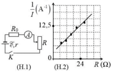 Trong bài thực hành xác định suất điện động E của một nguồn điện, một nhóm học sinh mắc mạch điện như hình vẽ (H.1). Nhóm học sinh đã tiến hành thí nghiệm, xử lý số liệu và vẽ được đồ thị biểu diễn sự phụ thuộc của nghịch đảo số chỉ ampe kế \(\left( {\dfrac{1}{I}} \right)\) theo giá trị của biến trở R như hình vẽ (H.2). Giá trị trung bình của E được xác định bởi thí nghiệm này là