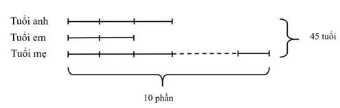 Hiện nay tuổi anh gấp 1,5 lần tuổi em và tuổi mẹ gấp hai tổng số tuổi của hai anh em. Biết tổng tuổi ba mẹ con là 45. Tuổi mẹ là: