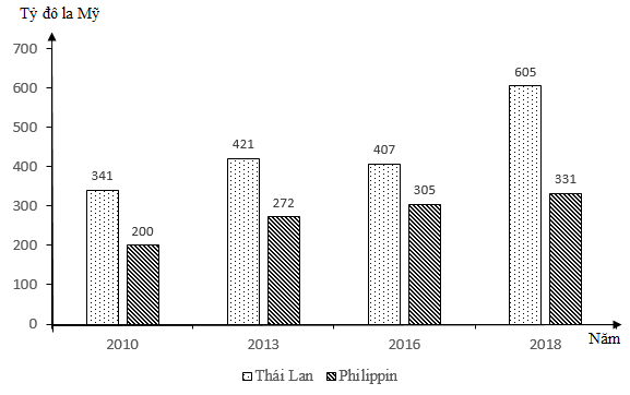 Cho biểu đồ:GDP CỦA THÁI LAN VÀ PHILIPIN TỪ NĂM 2010 - 2018 (Nguồn số liệu theo Niên giám thống
