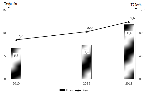 Cho biểu đồ:SẢN LƯỢNG THAN VÀ ĐIỆN CỦA PHI-LIP-PIN GIAI ĐOẠN 2010 -2018Theo biểu đồ, nhận