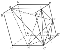 Cho khối hộp \(ABCD.A'B'C'D'\) có thể tích bằng \(V.\) Gọi \(M,N,P\) lần lượt là trung điểm của