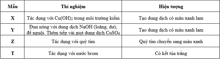 Tiến hành thí nghiệm với các chất X, Y, Z, T: Các chất X, Y, Z, T lần lượt