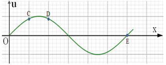 Một sóng cơ truyền trên sợi dây dài, nằm ngang, dọc theo chiều dương của trục Ox với tốc độ truyền sóng là v và biên độ không đổi. Tại thời điểm t0 = 0, phần tử tại O bắt đầu dao động từ vị trí cân bằng theo chiều âm của trục Ou. Tại thời điểm t1 = 0,3 s hình ảnh của một đoạn dây như hình vẽ. Khi đó vận tốc dao động của phần tử tại D là \({v_D} = \dfrac{\pi }{{\rm{8}}}{\rm{v}}\) và quãng đường phần tử E đã đi được là 24 cm. Biết khoảng cách cực đại giữa hai phần tử là 5cm. Phương trình truyền sóng là