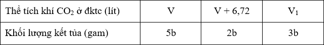 Dẫn a mol hỗn hợp X gồm hơi nước và khí cacbonic qua than nung đỏ thu được 4,5 mol hỗn hợp khí Y gồm CO, H2, CO2 trong đó có V1 lít (đktc) CO2. Hấp thụ hoàn toàn khí CO2 vào dung dịch có chứa 0,06b mol Ca(OH)2, khối lượng kết tủa tạo ra phụ thuộc vào thể tích khí CO2 được ghi ở bảng sau: