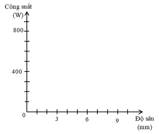2. Dựa vào đường biểu diễn vẽ được ở câu trên, xác định gần đúng công suất chùm vi sóng ở độ sâu 5mm trong khối thực phẩm.