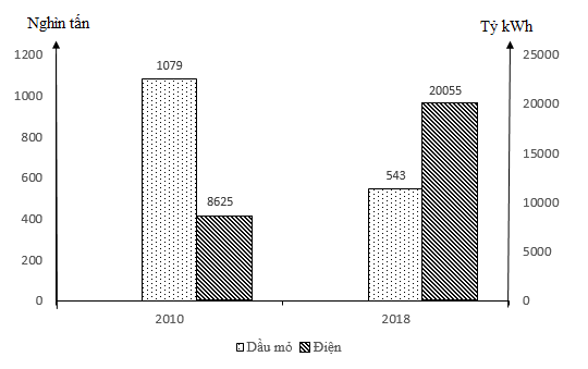 Cho biểu đồ: SẢN LƯỢNG DẦU THÔ VÀ ĐIỆN CỦA MI-AN-MA NĂM 2010 VÀ 2018 (Số liệu theo Niên