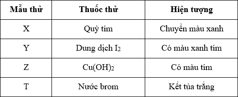 Kết quả thí nghiệm của các dung dịch X, Y, Z, T với thuốc thử được ghi ở bảng sau: