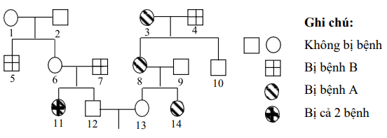Phả hệ ở hình dưới đây mô tả sự di truyền 2 bệnh ở người, mỗi bệnh đều do một gen có 2 alen quy định; Gen quy định bệnh B nằm ở vùng không tương đồng trên nhiễm sắc thể giới tính X quy định. Biết rằng không xảy ra đột biến. Theo lí thuyết, có bao nhiêu phát biểu sau đây đúng?