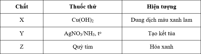 Kết quả thí nghiệm của các chất X, Y, Z với các thuốc thử được ghi ở bảng sau: Các chất