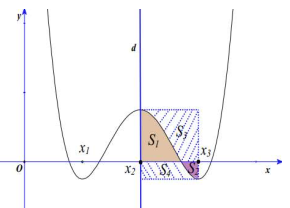 Cho hàm số bậc bốn \(y = f\left( x \right)\) có đồ thị \(\left( C \right)\) như hình vẽ bên. Biết hàm số \(y = f\left( x \right)\) đạt cực trị tại các điểm \({x_1},\,\,{x_2},\,\,{x_3}\) thỏa mãn \({x_3} = {x_1} + 2\), \(f\left( {{x_1}} \right) + f\left( {{x_3}} \right) + \dfrac{2}{3}f\left( {{x_2}} \right) = 0\) và \(\left( C \right)\) nhận đường thẳng \(d:\,\,x = {x_2}\) làm trục đối xứng. Gọi \({S_1},\,\,{S_2},\,\,{S_3},\,\,{S_4}\) là diện tích của các miền hình phẳng được đánh dấu như hình bên