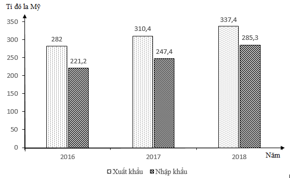 Theo biểu đồ, nhận xét nào sau đây đúng về sự thay đổi giá trị xuất, nhập khẩu hàng hóa và dịch vụ của Thái Lan giai đoạn 2016-2018?