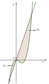 Cho đường cong \(\left( C \right):\,\,y = 4{x^3} - 3{x^2}\) và đường thẳng \(d\) đi qua gốc tọa độ tạo thành hai miền phẳng có diện tích \({S_1},\,\,{S_2}\) như hình vẽ.