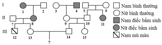 Sơ đồ phả hệ dưới đây mô tả sự di truyền của bệnh điếc bẩm sinh và bệnh mù màu ở người.