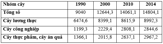Nhận xét nào sau đây đúng về diện tích gieo trồng phân theo nhóm cây trồng của nước ta giai đoạn 1990 – 2014?
