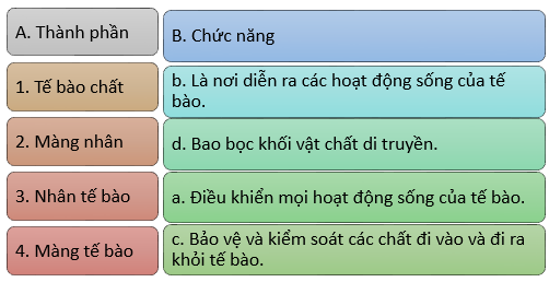 Nối thành phần tế bào ở cột A với chức năng ở cột B sao cho phù hợp