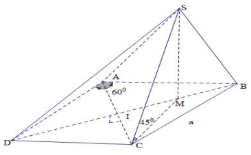 Cho hình chóp \(S.ABCD\) đáy là hình thoi tâm \(I\), cạnh \(a\), góc \(\angle BAD = {60^0}\). Hình chiếu vuông góc của \(S\) trên mặt phẳng đáy là trung điểm \(M\) của \(BI\). Góc giữa \(SC\) và mặt phẳng đáy bằng \({45^0}\). Tính theo \(a\) thể tích khối chóp \(S.ABCD\).