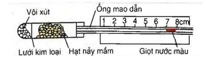 Hình bên mô tả thí nghiệm phát hiện hô hấp ở thực vật. Thí nghiệm được thiết kế đúng chuẩn quy định. Sau 1 thời gian, giọt màu di chuyển dần sang vị trí 7, 6, 5 do thể tích khí trong dụng cụ