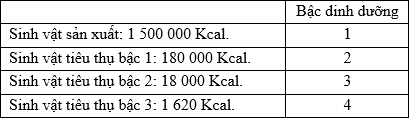 Sinh vật tiêu thụ bậc 2: 18 000 Kcal. Sinh vật tiêu thụ bậc 3: 1 620 Kcal.