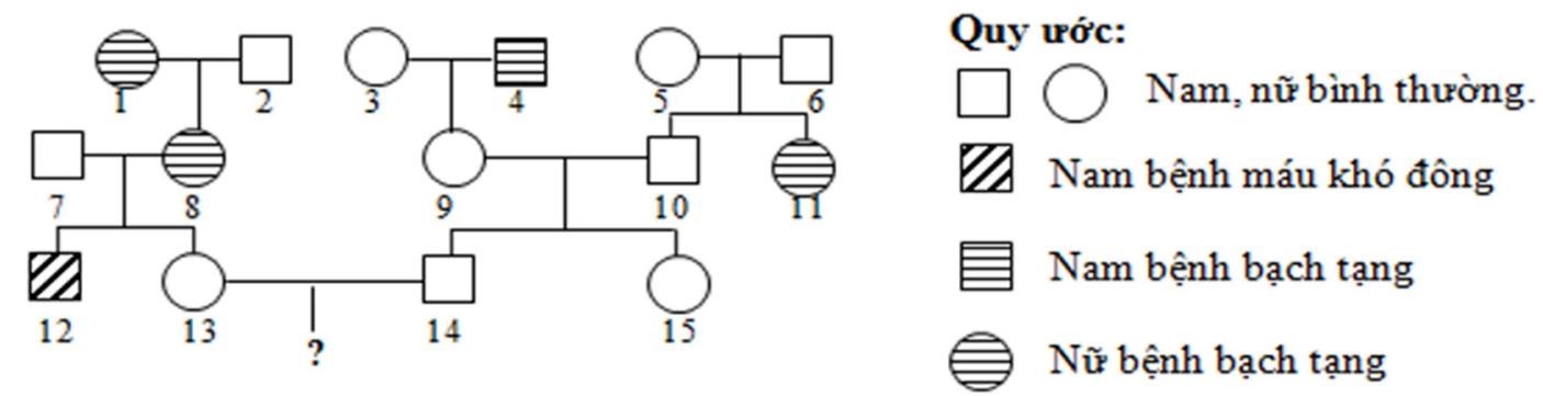 Ở người, bệnh bạch tạng do gen lặn nằm trên NST thường quy định, bệnh máu khó đông do gen lặn nằm trên vùng không tương đồng của NST giới tính X quy định; các alen trội tương ứng quy định không bị bệnh. Sơ đồ phả hệ sau mô tả sự di truyền của 2 bệnh này trong 1 gia đình: