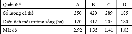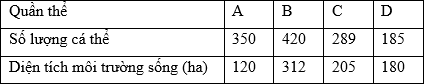 Có 4 quần thể của cùng một loài có số lượng cá thể và diện tích môi trường sống tương ứng như sau: