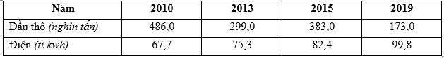 Cho bảng số liệu:SẢN LƯỢNG DẦU THÔ VÀ ĐIỆN CỦA PHI-LIP-PIN GIAI ĐOẠN 2010-2019 (Nguồn: Niên
