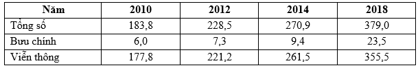Cho bảng số liệu:DOANH THU HOẠT ĐỘNG BƯU CHÍNH, VIỄN THÔNG NƯỚC TA, GIAI ĐOẠN 2010 - 2018(Đơn