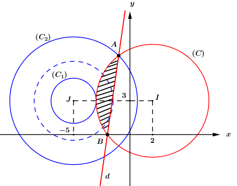 Cho số phức \(z = x + yi\,\,\left( {x,y \in \mathbb{R}} \right)\) thỏa mãn \(\left| {z - 2 - 3i} \right| \le 5\)