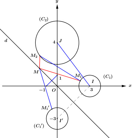 Xét ba số phức \(z,\,\,{z_1},\,\,{z_2}\) thỏa mãn \(\left| {z - i} \right| = \left| {z + 1} \right|,\,\,\left| {{z_1} - 3\sqrt 5 } \right| = \sqrt 5 \) và \(\left| {{z_2} - 4\sqrt 5 i} \right| = 2\sqrt 5 \). Giá trị nhỏ nhất của \(\left| {\sqrt 5 z - {z_1}} \right| + \left| {\sqrt 5 z - {z_2}} \right|\) bằng: