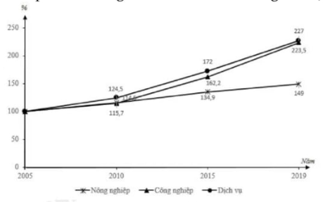 Cho biểu đồ về GDP phân theo ngành kinh tế ở nước ta giai đoạn 2005 - 2019:Biểu đồ thể hiện