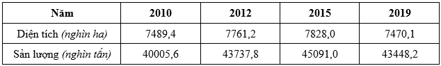 Cho bảng số liệu:DIỆN TÍCH VÀ SẢN LƯỢNG CỦA NƯỚC TA, GIAI ĐOẠN 2010-2019(Nguồn: Niên giám