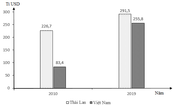 Cho biểu đồ:GIÁ TRỊ XUẤT KHẨU CỦA NAM VÀ THÁI LAN NĂM 2010 VÀ 2019 (Nguồn: