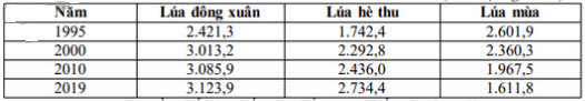 Cho bảng số liệu:DIỆN TÍCH LÚA PHÂN THEO MÙA VỤ Ở NƯỚC TA, GIAI ĐOẠN 1995-2019(Đơn vị: Nghìn