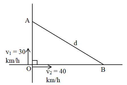 Hai xe chuyển động thẳng đều trên hai con đường vuông góc với nhau với vận tốc 30 km/h và 40