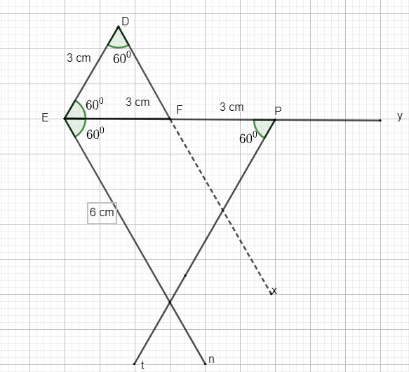 Vẽ tam giác \(DEF\) đều biết \(DE = 3cm\) và tam giác \(EPM\) đều sao cho \(F\) nằm giữa \(E\) và \(P\) và \(EP = 6cm\) và \(E,D,M\) không thẳng hàng.