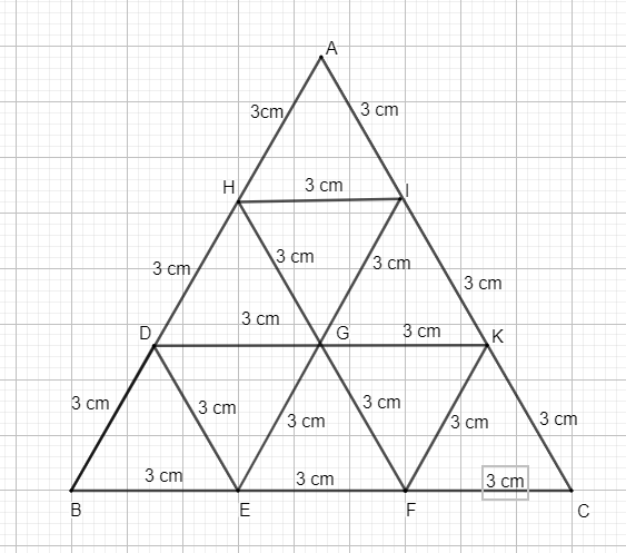 a) Vẽ các tam giác đều sau: Tam giác \(BDE\) có độ dài cạnh bằng \(3cm\), tam giác \(DGE\) , tam giác \(GEF\) (\(B,E,F\) thẳng hàng), tam giác \(DGH\) (\(B,D,H\) thẳng hàng), tam giác \(GHI\), tam giác \(GFK\) (\(H,G,F\) thẳng hàng).