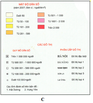 Trong các hình ảnh trên, cho biết yếu tố dân cư được thể hiện ở bảng chú giải nào?