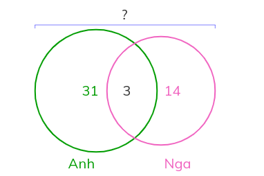 Trong hội nghị quốc tế, người ta huy động một số người phiên dịch tiếng Anh và tiếng Nga, biết số cán bộ phiên dịch tiếng Anh là \({\rm{31}}\) người, số cán bộ phiên dịch tiếng \({\rm{Nga}}\) là \({\rm{14}}\) người, số cán bộ phiên dịch được cả hai thứ tiếng là \({\rm{3}}\) người. Hỏi tổng số cán bộ phiên dịch là bao nhiêu người?