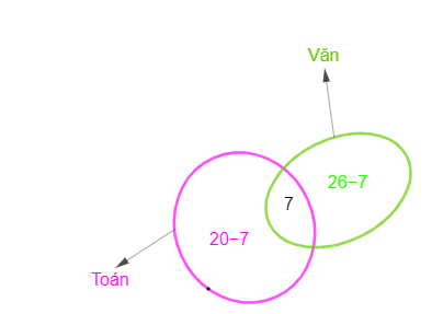 Lớp 9A có \(20\) học sinh thích học Toán và \(26\)học sinh thích học Văn và \(7\) học sinh thích cả Toán và Văn. Hỏi:
