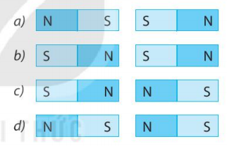 Có hai thanh nam châm giống hệt nhau được lần lượt sắp xếp như hình vẽ bên. Trong những trường hợp nào có lực đẩy? Lực đó là lực tiếp xúc hay không tiếp xúc?