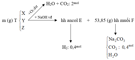 Hỗn hợp T gồm ba este mạch hở X (đơn chức), Y (hai chức), Z (ba chức), đều được tạo thành từ axit cacboxylic và ancol. Đốt cháy hoàn toàn m gam T, thu được H2O và 2,0 mol CO2. Xà phòng hóa hoàn toàn m gam T bằng dung dịch NaOH vừa đủ, thu được hỗn hợp E gồm hai ancol (có cùng số nguyên tử cacbon trong phân tử) và 53,85 gam hỗn hợp muối F. Cho E tác dụng hết với kim loại Na dư, thu được 0,4 mol H2. Đốt cháy toàn bộ F, thu được H2O, Na2CO3 và 0,4 mol CO2. Khối lượng của Y trong m gam T là