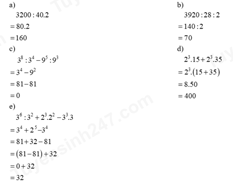 e) \({3^6}:{3^2} + {2^3}{.2^2} - {3^3}.3\)