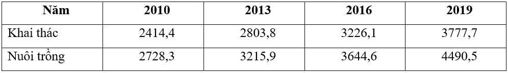 Cho bảng số liệu:SẢN LƯỢNG THỦY SẢN CỦA NƯỚC TA GIAI ĐOẠN 2010 - 2019 (Đơn vị: Nghìn