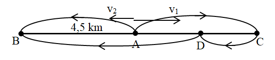 Ca nô đi ngược dòng qua điểm A thì gặp một bè gỗ trôi xuôi. Ca nô đi tiếp 40 phút, do hỏng máy nên bị trôi theo dòng nước. Sau 10 phút sửa xong máy, ca nô quay lại đuổi theo bè và gặp bè tại B. Biết \(AB = 4,5\,\,km\), công suất của ca nô không đổi trong suốt quá trình chuyển động. Tìm vận tốc dòng nước.