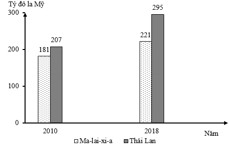 Theo biểu đồ, nhận xét nào sau đây đúng về sự thay đổi giá trị nhập khẩu năm 2018 so với năm 201o của Ma-lai-xi-a và Thái Lan?