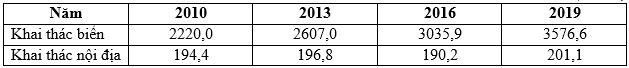 Cho bảng số liệu:SẢN LƯỢNG THỦY SẢN KHAI THÁC CỦA NƯỚC TA GIAI ĐOẠN 2010 – 2019.(Đơn vị:
