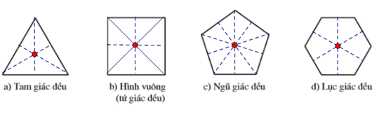 Em hãy tự xác định tâm đối xứng của các hình sau đây: Hình tam giác đều, hình vuông, hình ngũ giác đều, hình lục giác đều.
